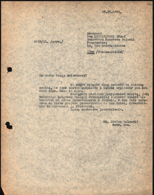 | Opis: | List do J. Kudlikowskiego z 27.11.1951. dot. m.in. planowanej wizyty u Min. ds. Ludności i Zdrowia. |