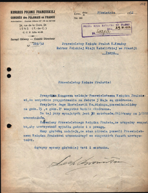 | Opis: | List B. Lecha do K. Kwaśnego z 27.04.1952 dot. organizacji obchodów święta 3 Maja . |