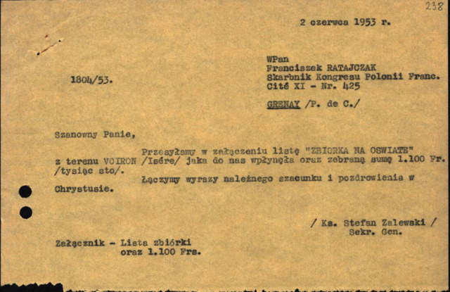 | Opis: | List S. Zalewskiego do F. Ratajczaka z 02.06.1953 dot. zbiórki funduszy na działalność oświatową Kongresu. |