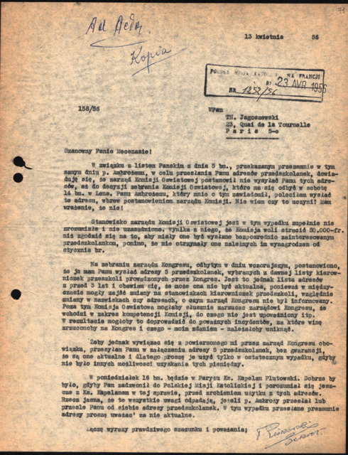 | Opis: | List T. Piskorskiego do T. Jagoszewskiego z 13.04.1956. Dot. Komisji Oświatowej. |