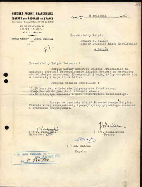 | Opis: | Zaproszenie dla K. Kwaśnego w obchodach Święta 3 Maja w Lille z 08.04.1961. |