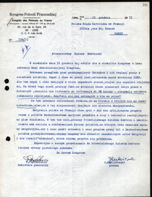 | Opis: | List Zarządu Kongresu do K. Kwaśnego z 21.12.1971. |