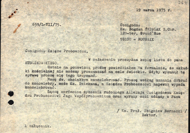 | Opis: | List Z. Bernackiego do ks. B. Śmiglaka z 19.03.1975. |