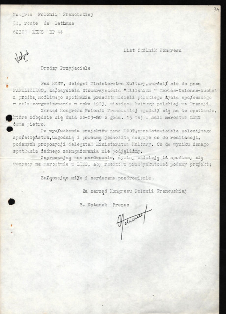 | Opis: | List z 03.1980 dot. organizacji Miesiąca Kultury Polskiej we Francji. |