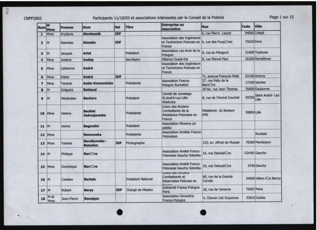 Opis: | Participants 11/10/03 et associations interesses par le Conseil de la Polonia. |