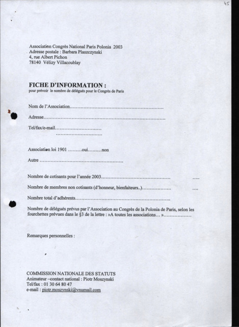 Opis: | Association Congres National Paris Polonia 2003, Fiche d'information pour prevoir le nombre de delegues pour le Congres de Paris. |