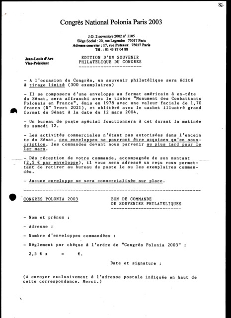 Opis: | Congres National Polonia Paris 2003, Edition d'un souvenir philatelique du Congres. |