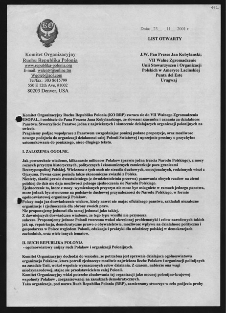 Opis: | Fragment listu otwartego Komitetu Organizacyjnego Ruchu Republika Polonia z 23.11.2001. |