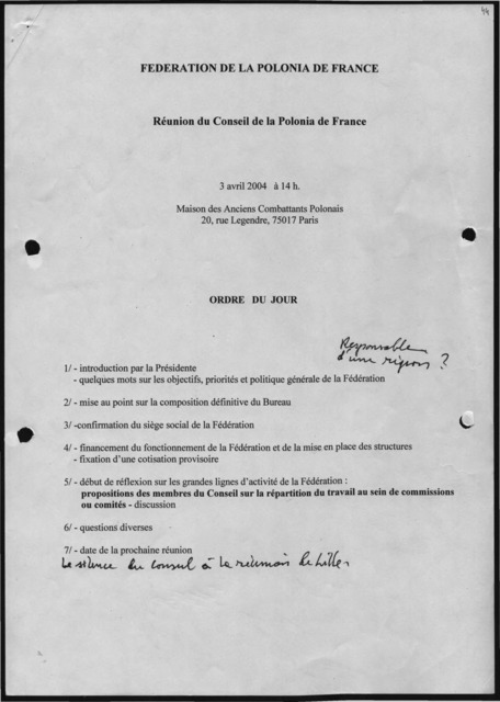 Opis: | Federation de la Polonia de France, Reunion du Conseil de la Polonia de France, 3 avril 20024 [...], Orde du Jour. |