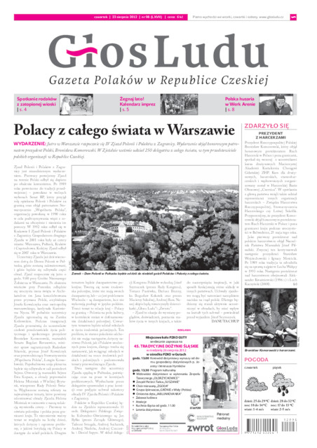 Opis: Gazeta Polaków w Republice Czeskiej. Przy wsparciu finansowym Ministerstwa Kultury RC wydaje Kongres Polaków w RC. Redaktor naczelny: Tomasz Wolff. ISSN 1212-4222.